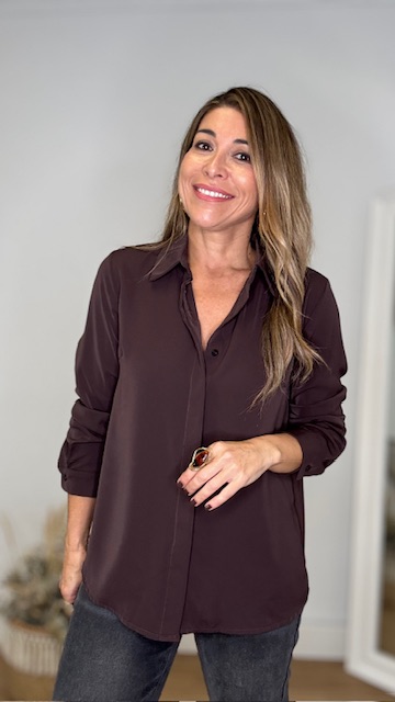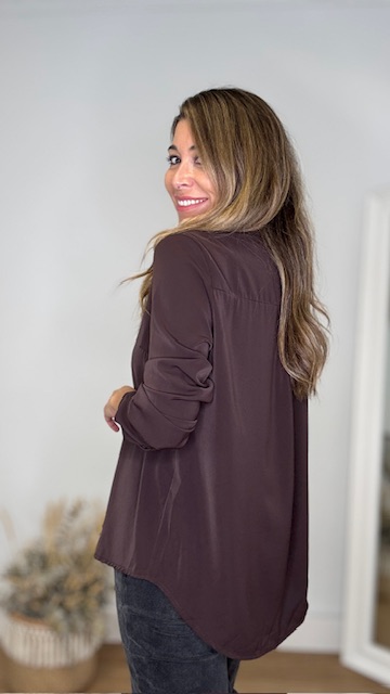 Camisa de crepé en color marrón con botonadura delantera. Talla única válida desde la 36 hasta la 42/44.