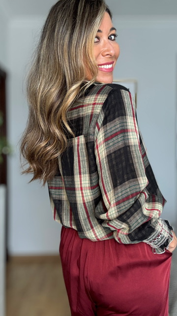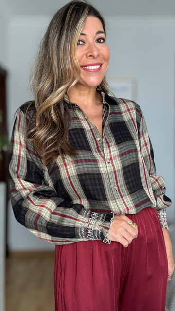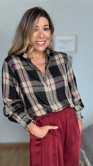 Blusa confeccionada en tejido de algodón con estampado de cuadros. Disponible por tallas.