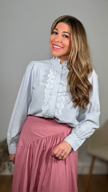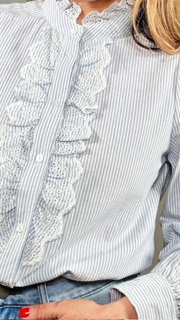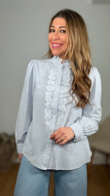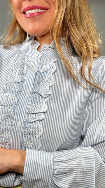 Camisa de estampado de mil rayas en color celeste con detalle de tira bordada en la botonadura y cuello. Disponible en tallas SMLXL