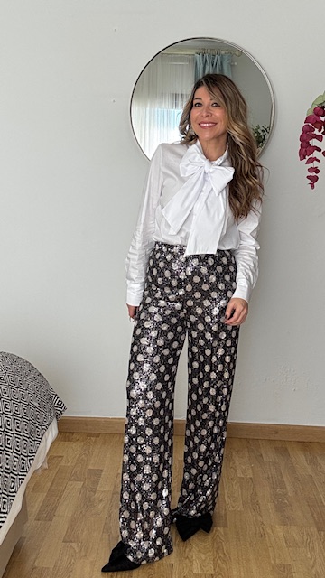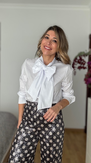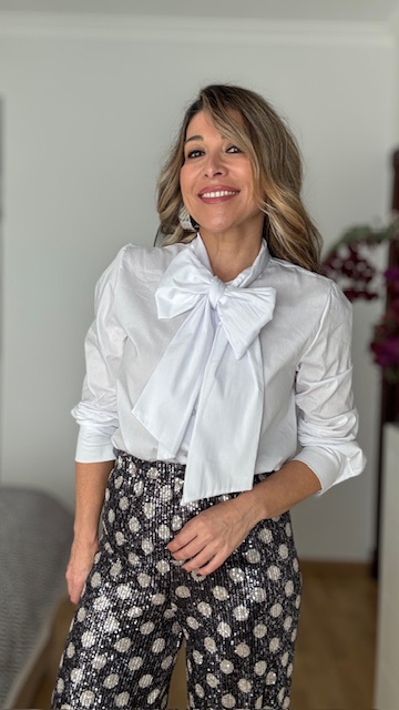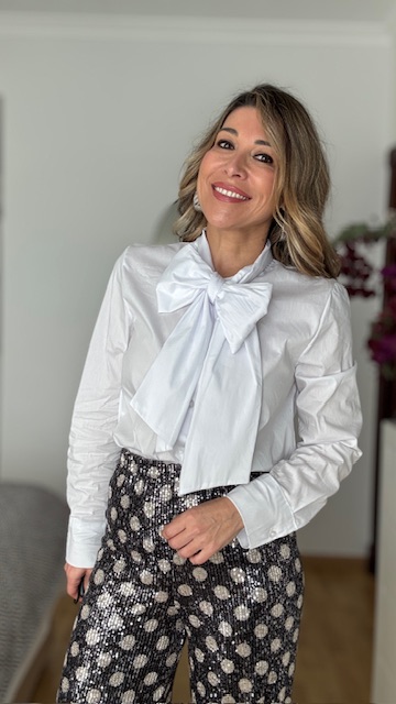 Camisa blanca confeccionada en tejido de popelín con botonadura delantera, cuello redondo y con lazada al cuello. Talla única.