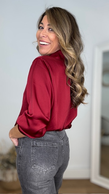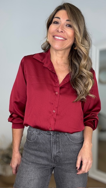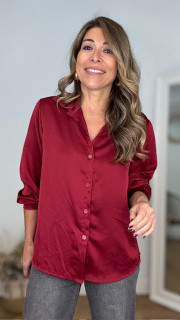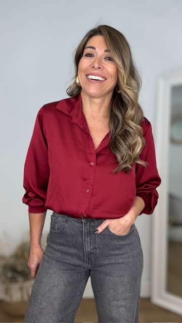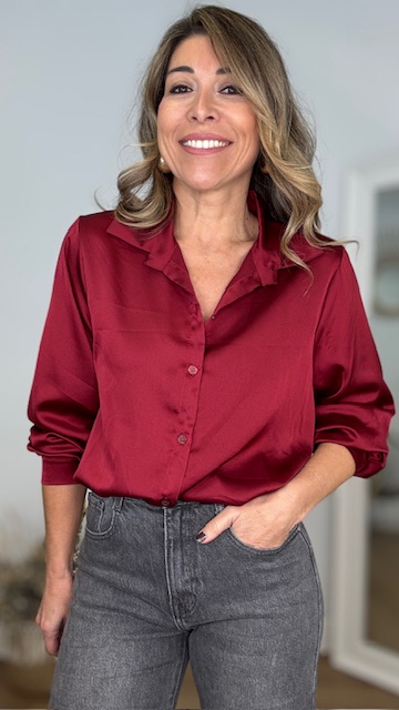 Camisa satinada en color burdeos con botonadura delantera. Talla única válida desde la 36 hasta la 44.