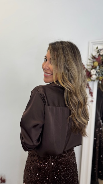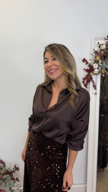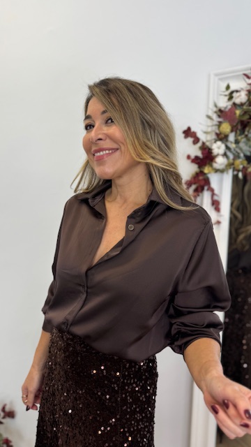 Camisa satinada en color marrón con botonadura delantera. Talla única válida desde la 36 hasta la 44.