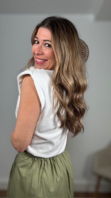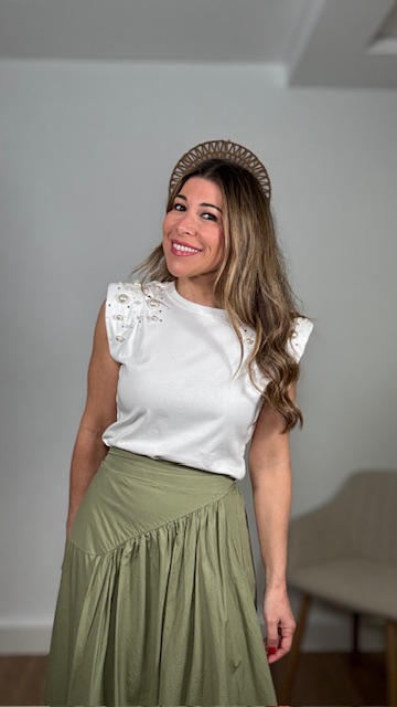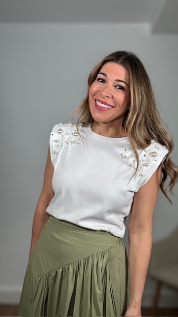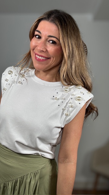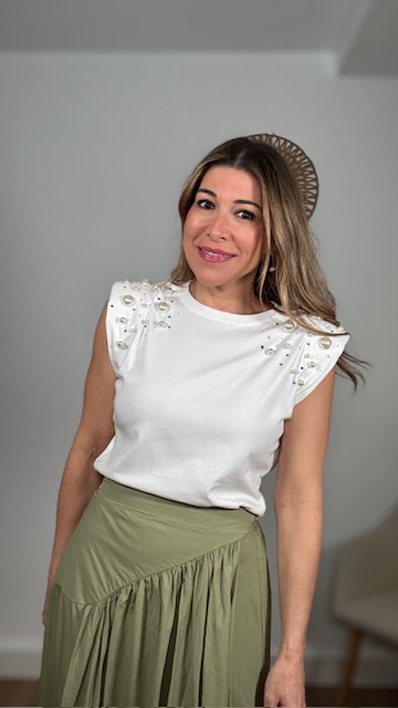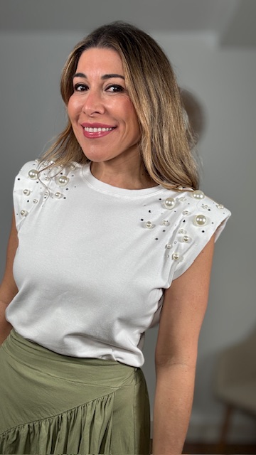 Camiseta de color blanca con hombreras y detalle de perlas. Talla única válida para tallas 36-40-42-44.