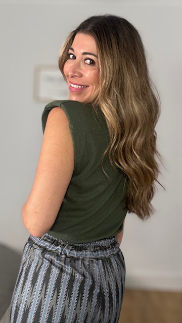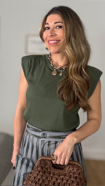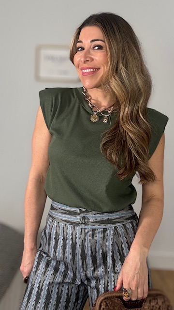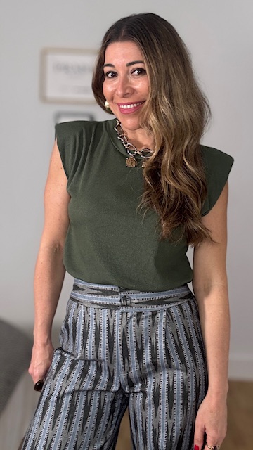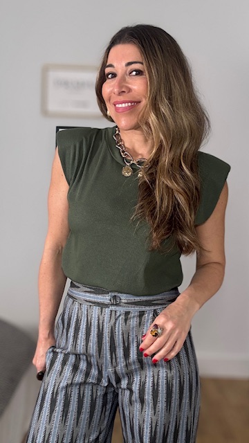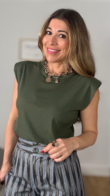 Camiseta con mangas a la sisa con hombreras en tejido de canalé en color verde caza. Talla única válida desde la talla 36 hasta la talla 44.