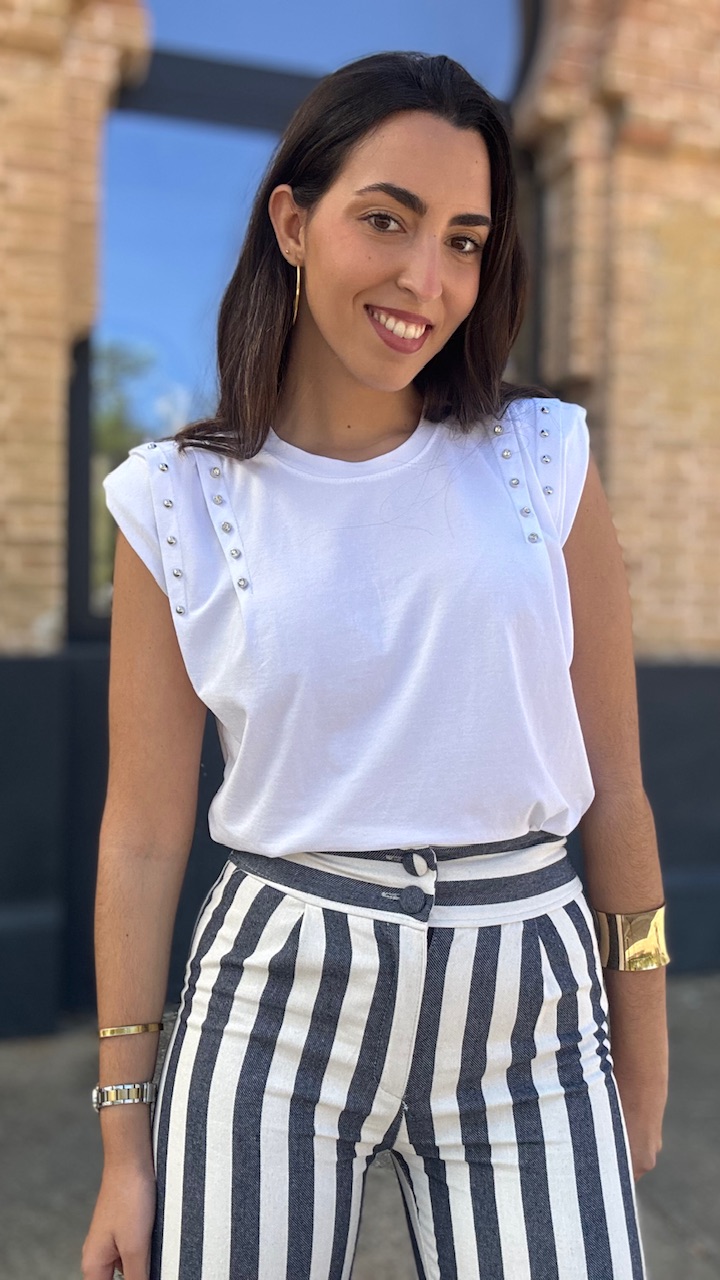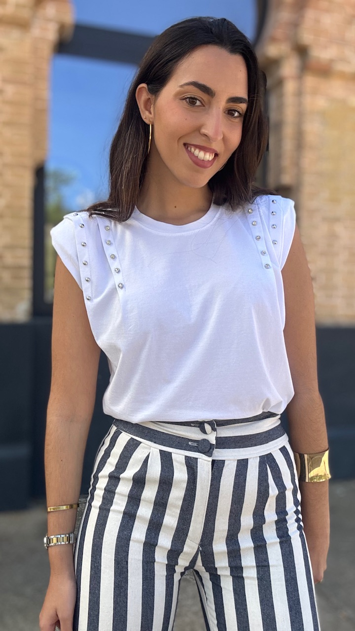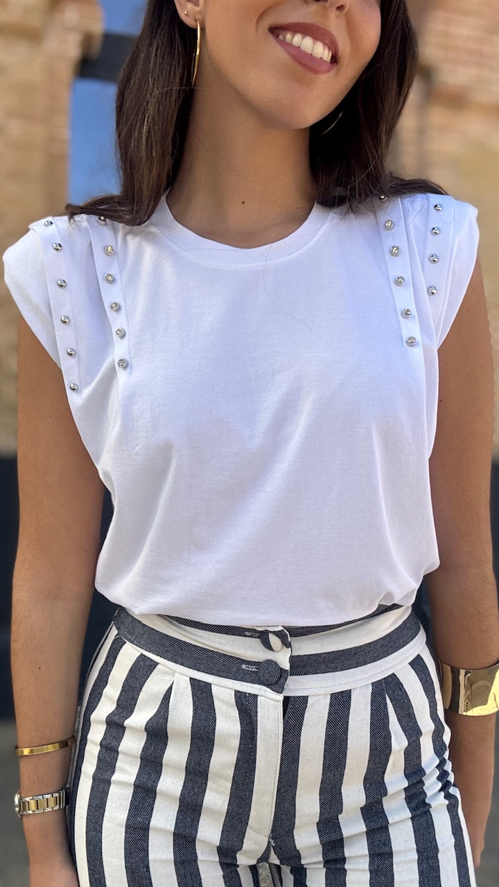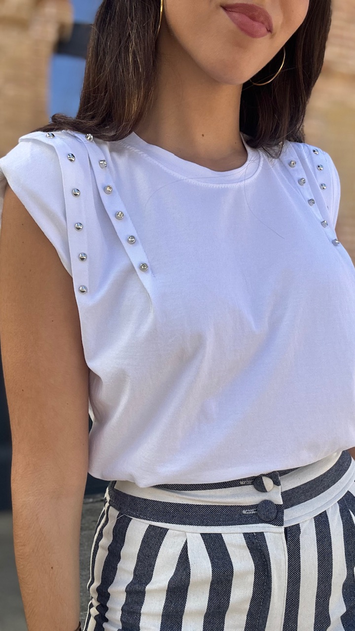 Camiseta de algodón en color blanca con hombreras y tachas de brillos planteadas . Talla única válida desde la talla 36 hasta la talla 44.