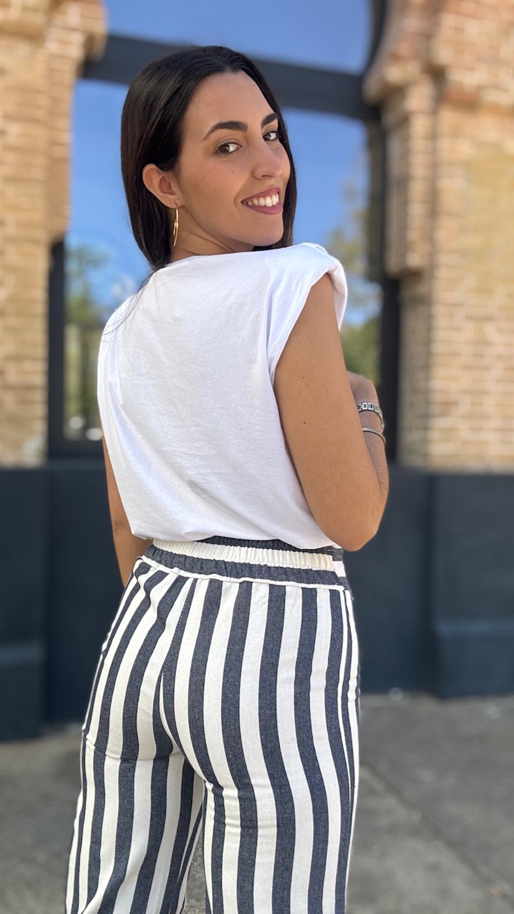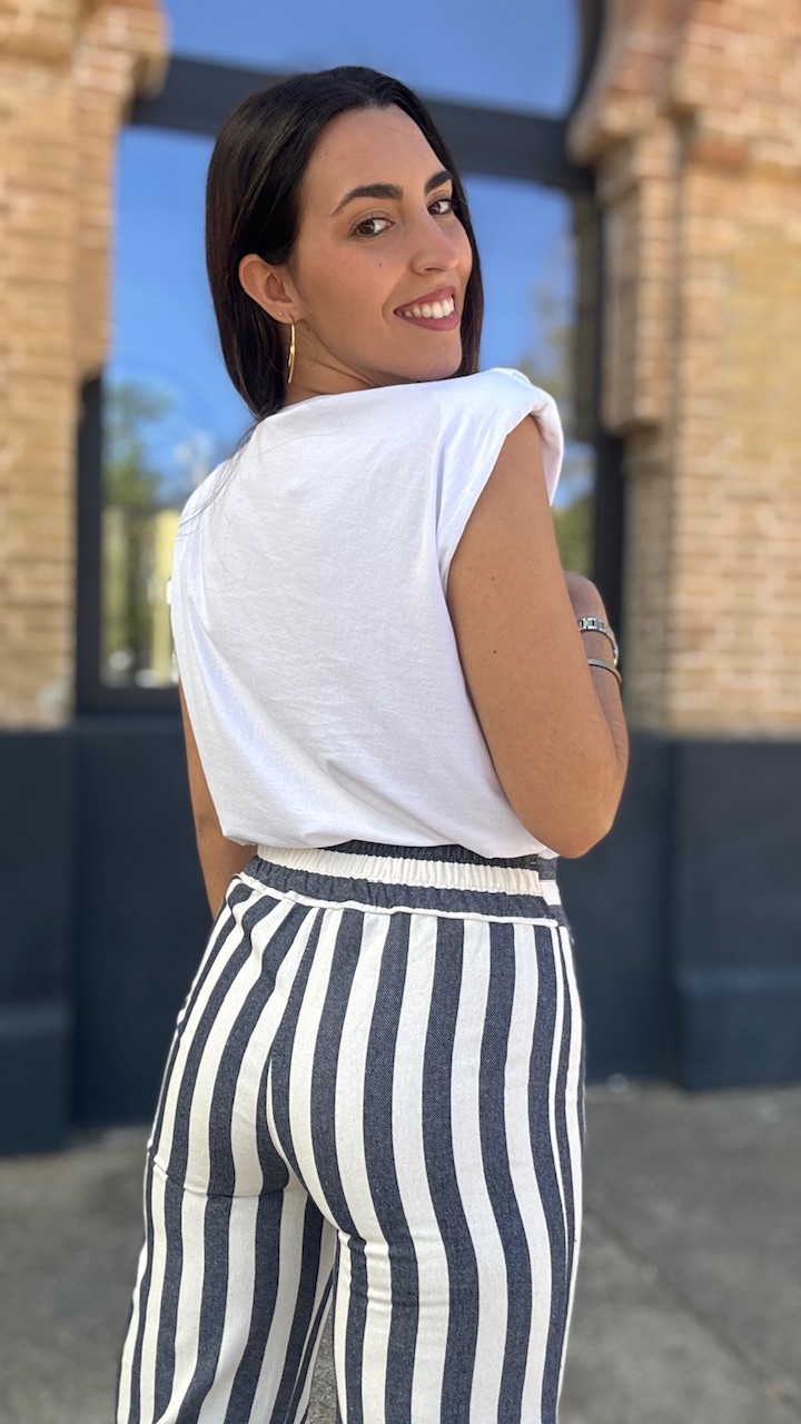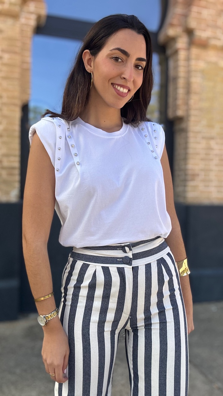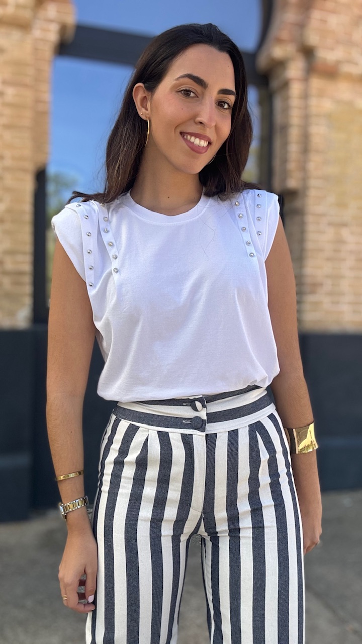 Camiseta de algodón en color blanca con hombreras y tachas de brillos planteadas . Talla única válida desde la talla 36 hasta la talla 44.