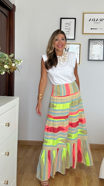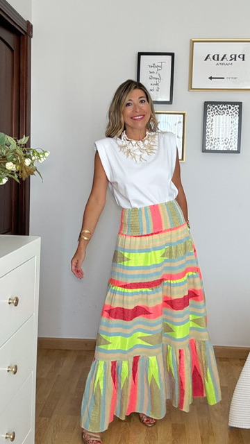 Camiseta confeccionada en tejido de algodón con hombreras en color blanca. Talla única válida desde la 36 hasta la 44.