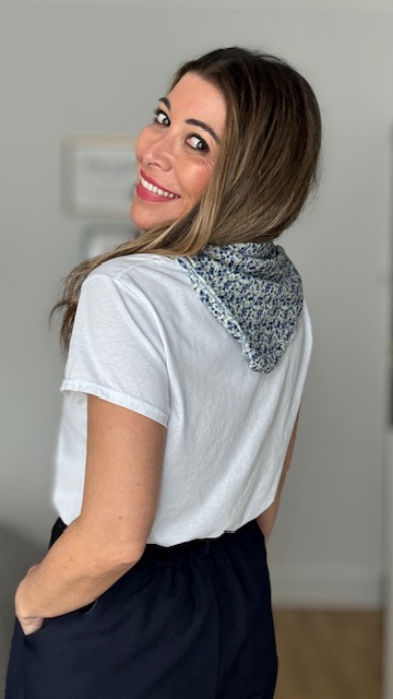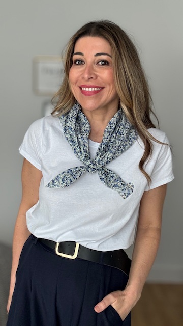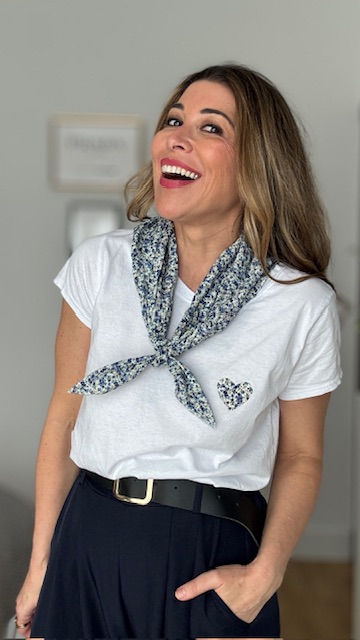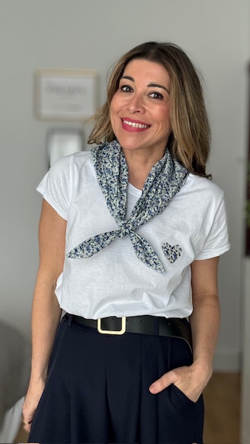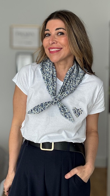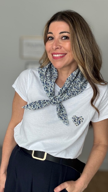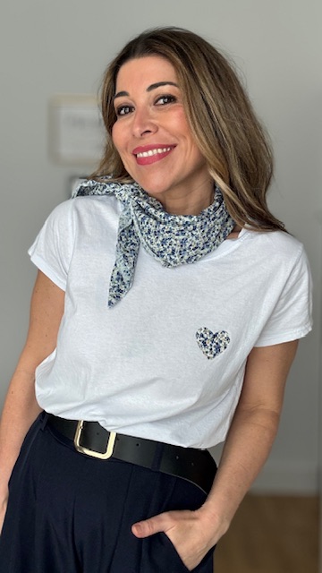 Camiseta de manga corta en color blanca con dibujo en la parte izquierda con pañuelo incluido. Talla única válida desde la 36 hasta la 44.