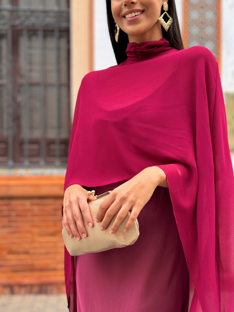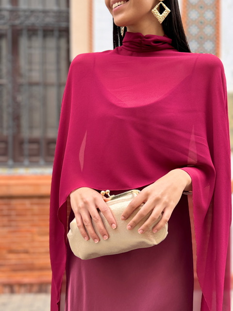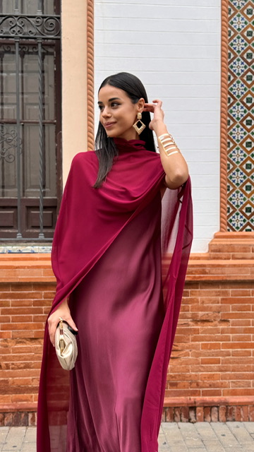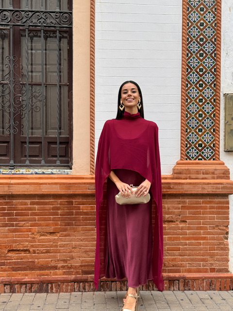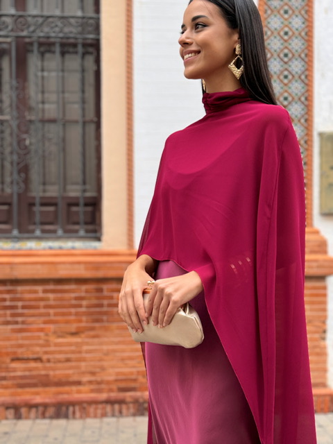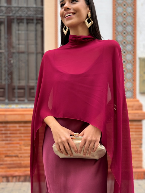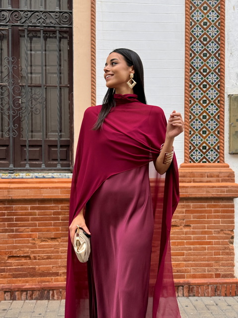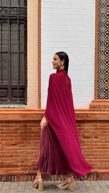 Capa confeccionada en tejido de gasa en color burdeos de corte asimétrico, lleva cuello fruncido con cierre de botón por detrás. Tamaño único.