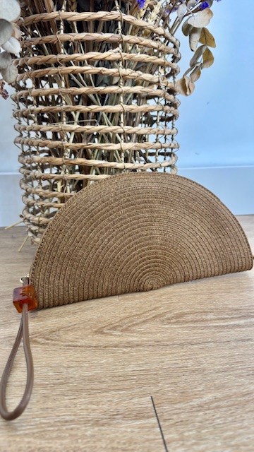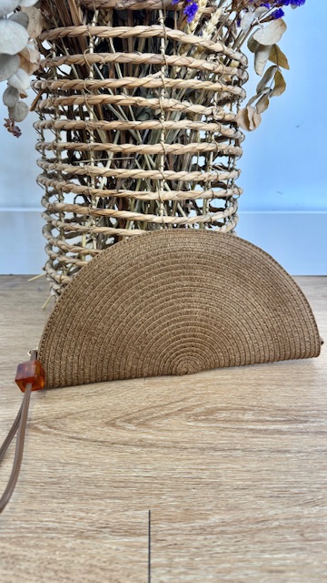 Cartera de rafia en color camel en forma de abanico con detalle de bola en la terminación de la cremallera.