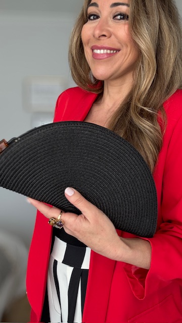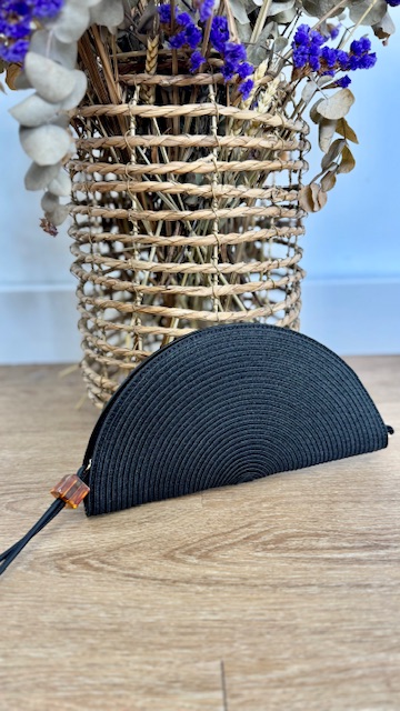 Cartera de rafia en color negra en forma de abanico con detalle de bola en la terminación de la cremallera.