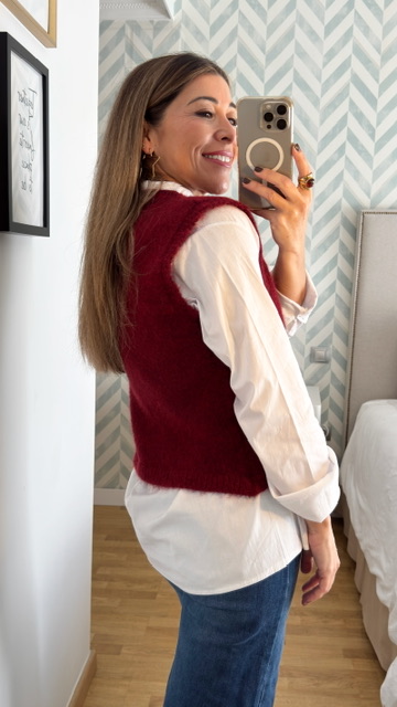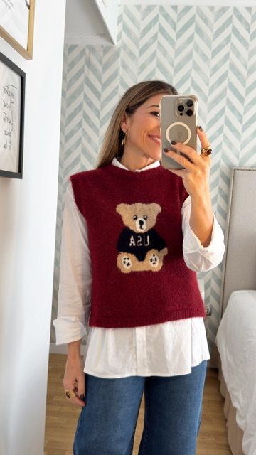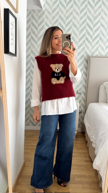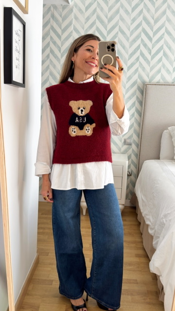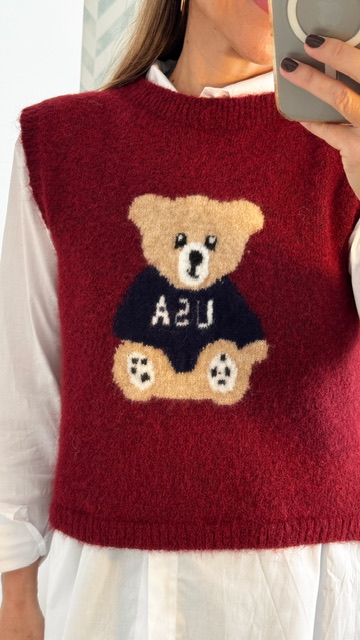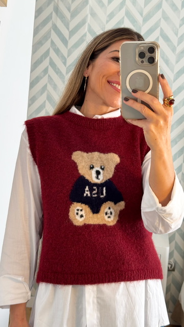 Chaleco sin mangas con dibujo de oso en la parte delantera en color burdeos. Talla única válida desde la 36 hasta la 44.