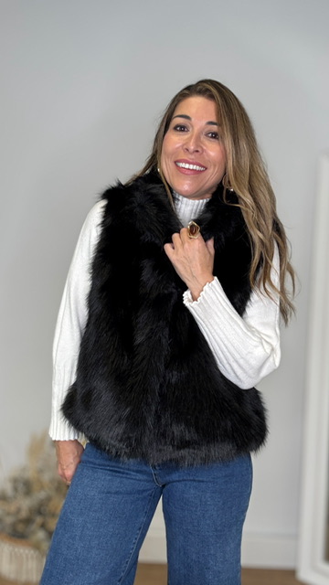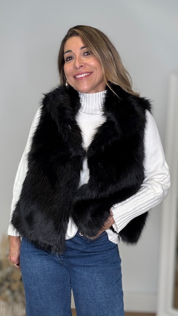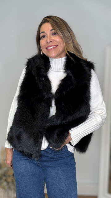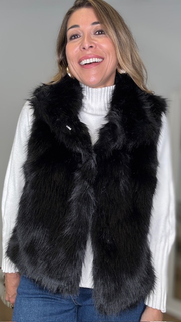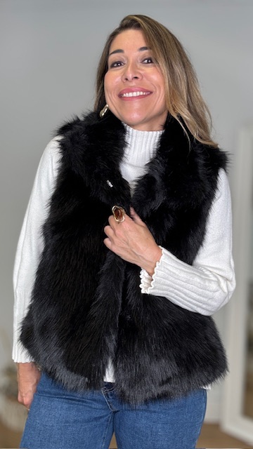 Chaleco de pelo sintético sin mangas en color negro. Talla única válida desde la 36 hasta la 44.