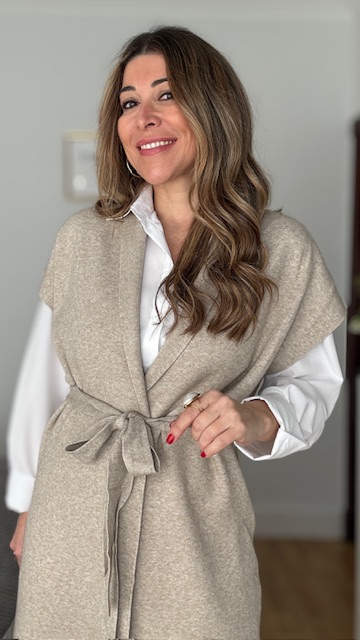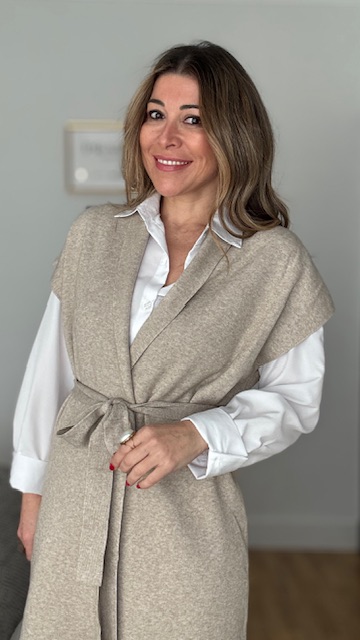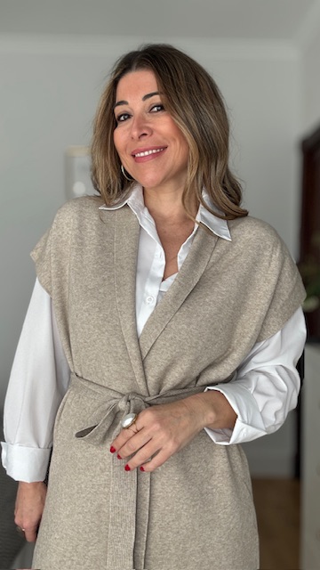 Chaleco punto largo en color topo. Talla única válida desde la 36 hasta la 44.