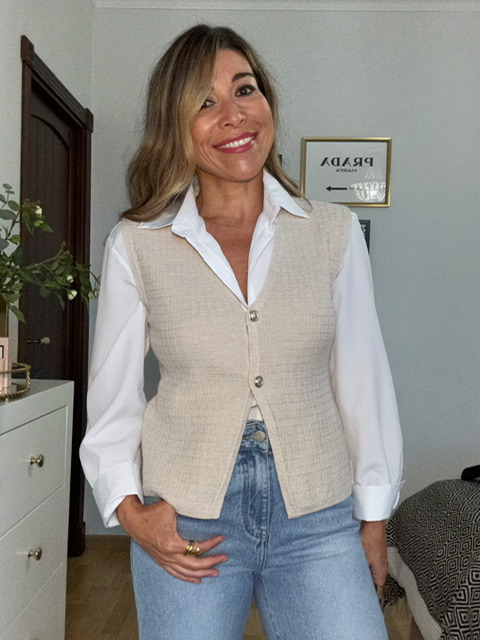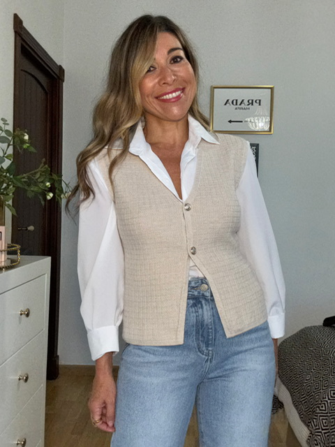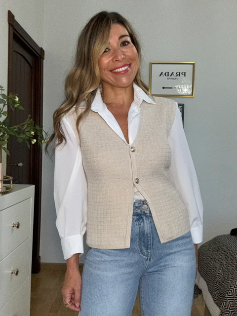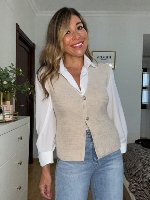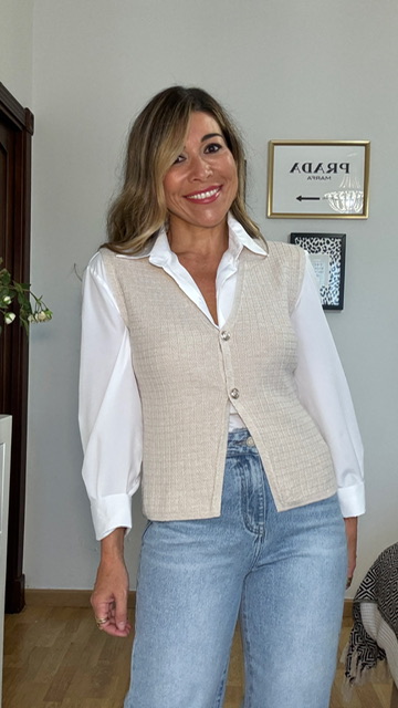 Chaleco de punto en color beige con botonadura dorada en la parte delantera. Talla única válida desde la 36 hasta la 40/42.