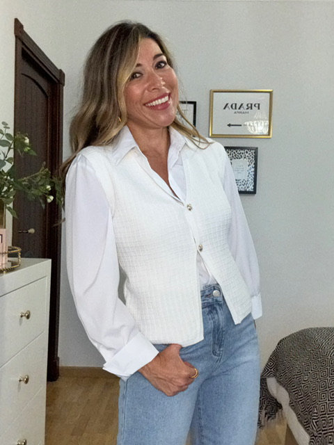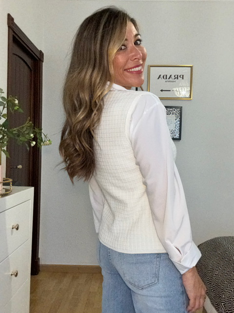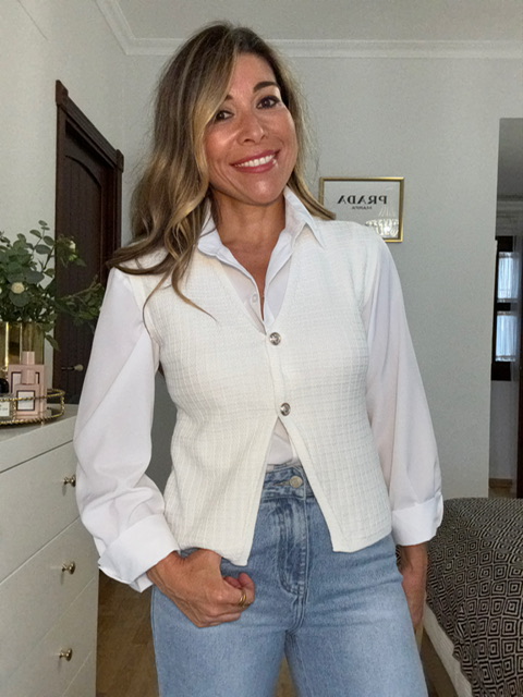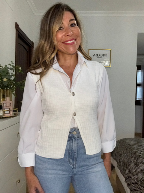 Chaleco de punto en color blanco con botonadura dorada en la parte delantera. Talla única válida desde la 36 hasta la 40/42.
