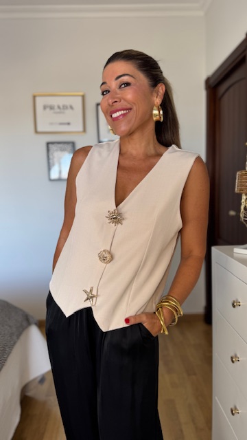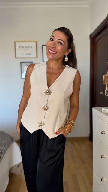 Chalequillo sastre en color beige decorado con botones tipo broche con distintas formas en color dorado en color negro. Lleva botones interiores normales para su correcta colocación. Talla única valida desde la 36 hasta la 40/42.