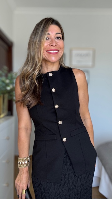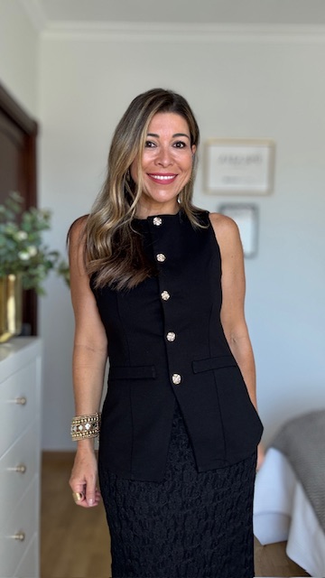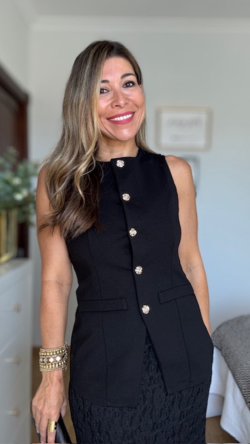 Chaleco de vestir con botonadura dorada de flor. Largo por la cadera. Talla única válida desde la 34 hasta la 38. Disponible en tres colores.