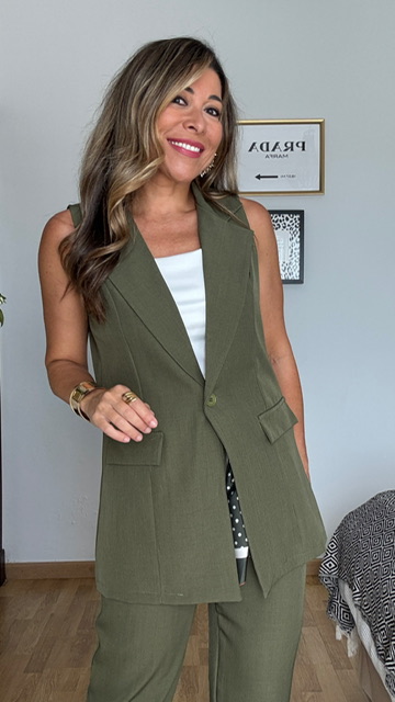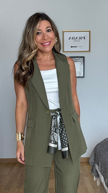 Chalequillo con botonadura delantera en color caza. Talla única válida desde la 36 hasta la 40/42. Se puede combinar con el pantalón zoe en verde caza.