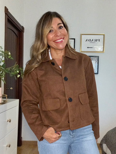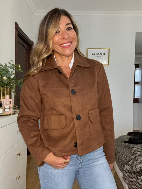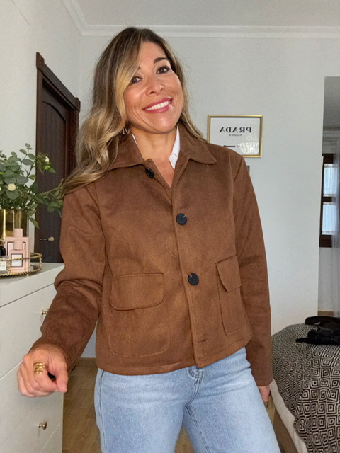 Chaqueta de antelina en color marrón con botonadura delantera y bolsillos tipo parches. No lleva forro. Talla única válida desde la 36 hasta la 44.