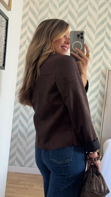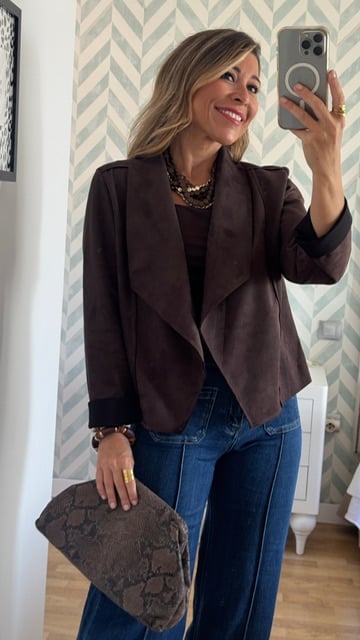 Chaqueta de antelina con solapas en color marrón. Talla única válida desde la 36 hasta la 44.