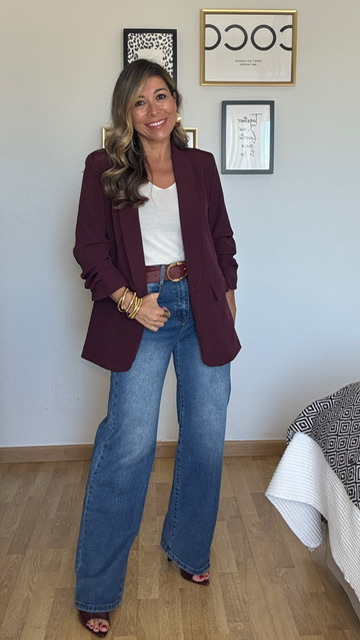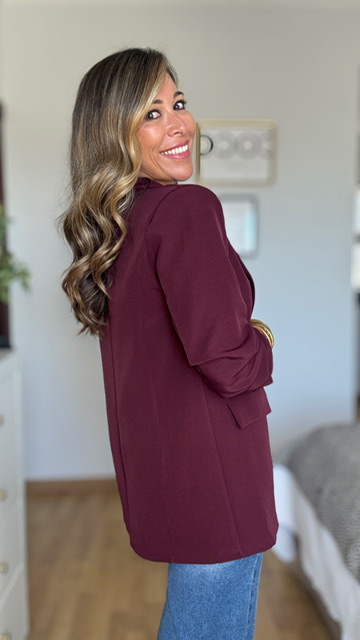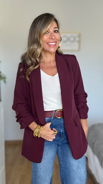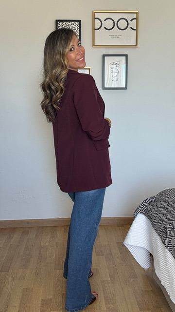 Blazer confeccionada en tejido de crepe en color burdeos .Lleva forro interior. Disponible por tallas.