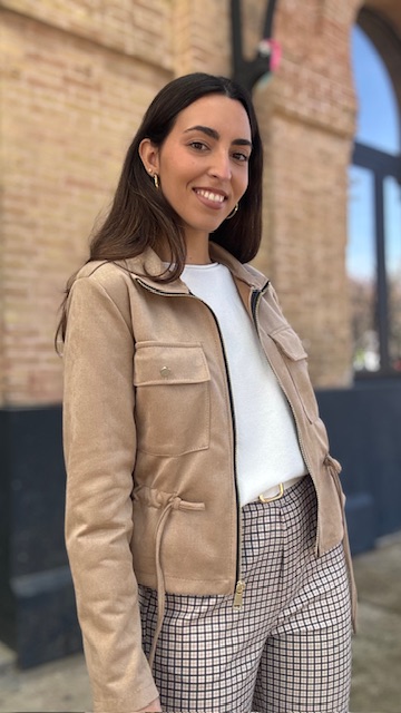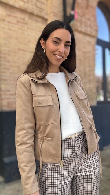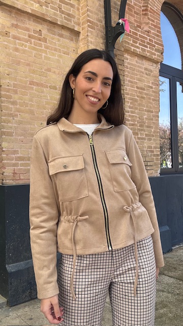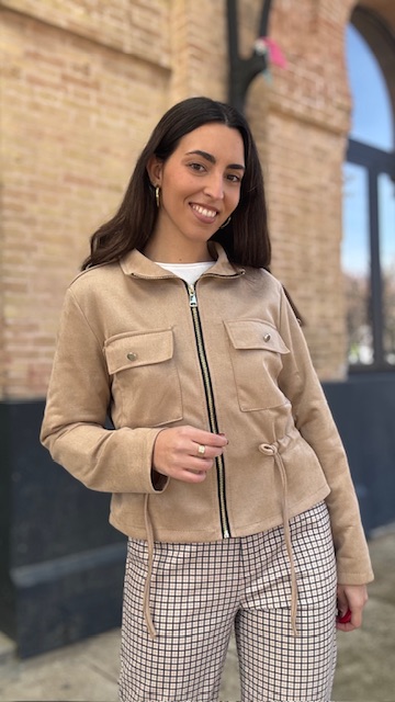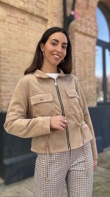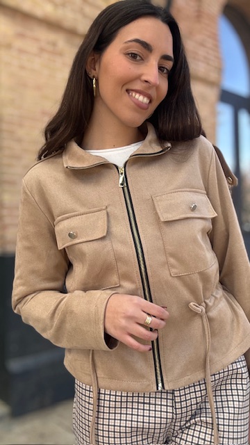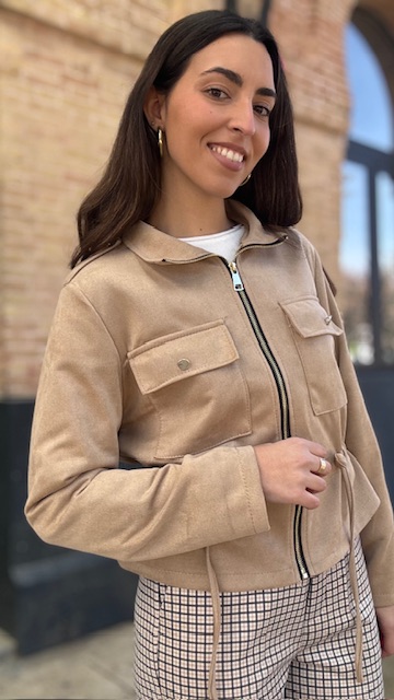 Chaqueta bomber de antelina en color camel. Talla única válida desde la 36 hasta la 44.