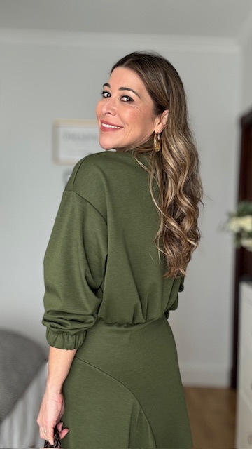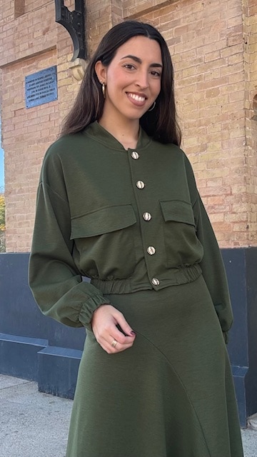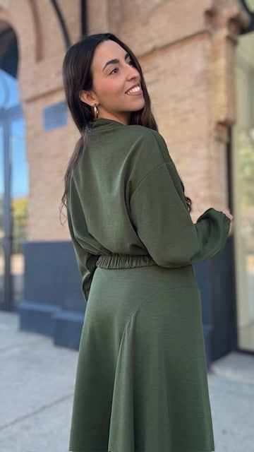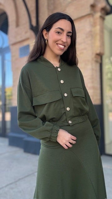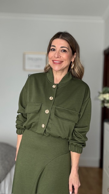 Chaqueta Bomber con botonadura delantera en color verde caza. Talla única válida desde la 36 hasta la 44.