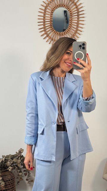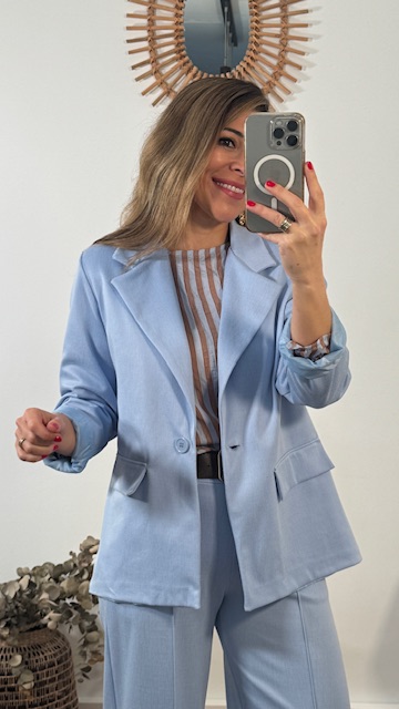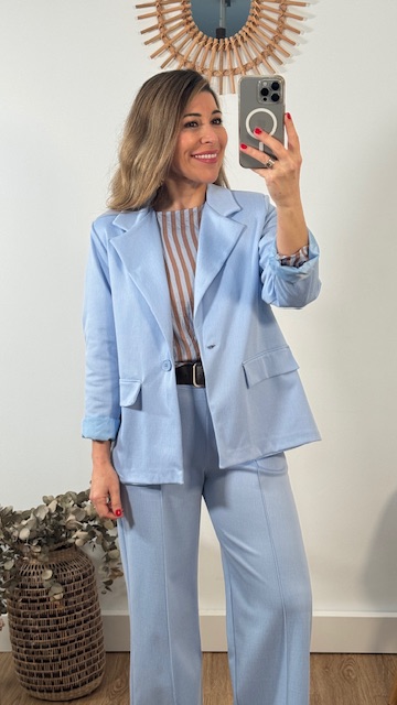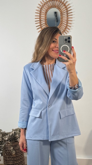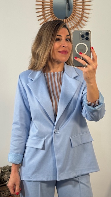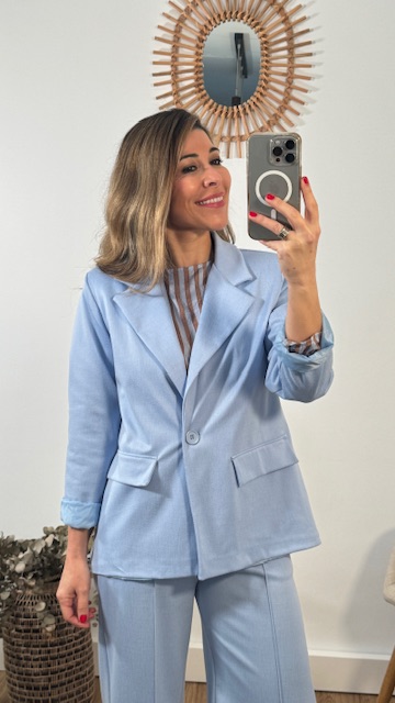 Chaqueta blazer en color celeste con botón en la parte delantera. Disponible por tallas.