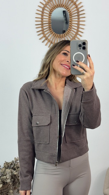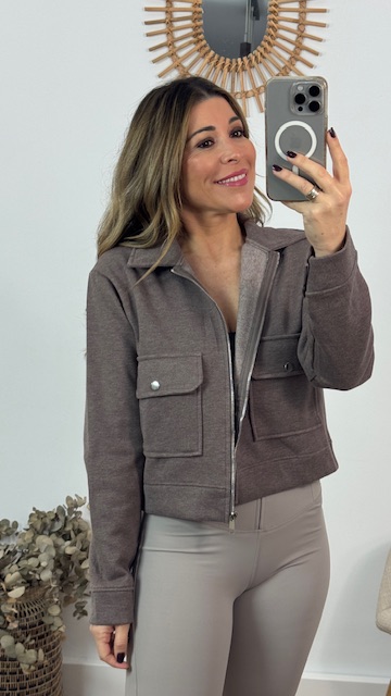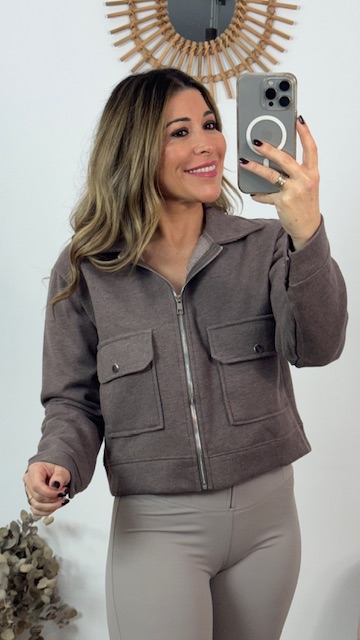 Chaqueta deportiva con bolsillos en la parte delantera en color topo. Talla única válida desde la 36 hasta la 44.