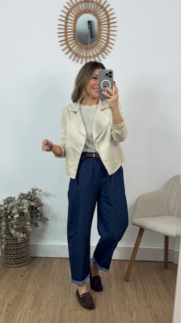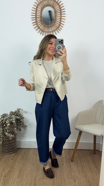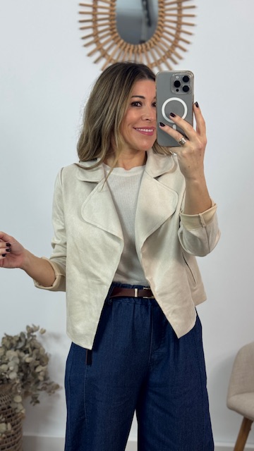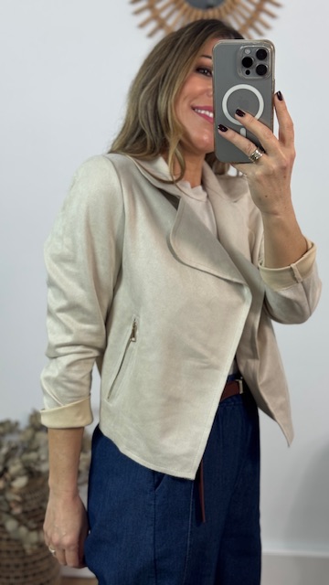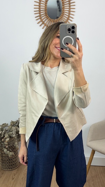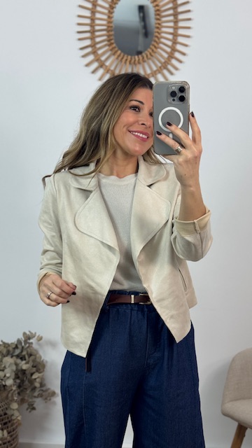 Chaqueta confeccionada en tejido de a tina en color beige. Talla única válida desde la 36 hasta la 42. Lleva Elastano.
