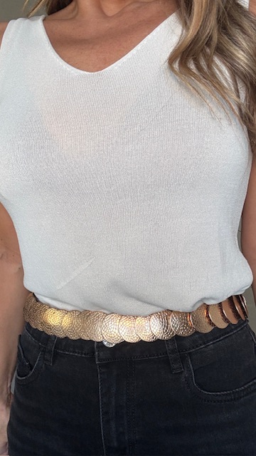 Cinturón elástico metálico en dorado envejecido . Da hasta la talla 44.