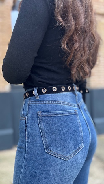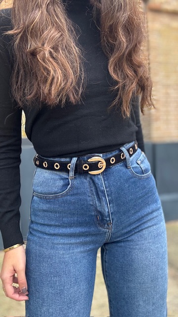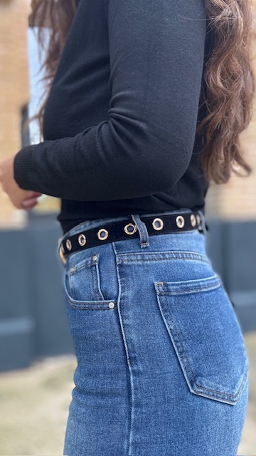 Cinturón de antelina de tachas doradas en color negro. Mide 90 cm.