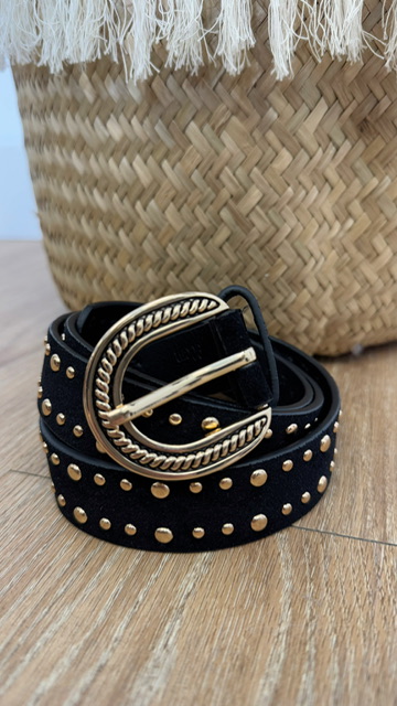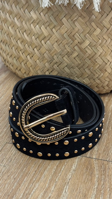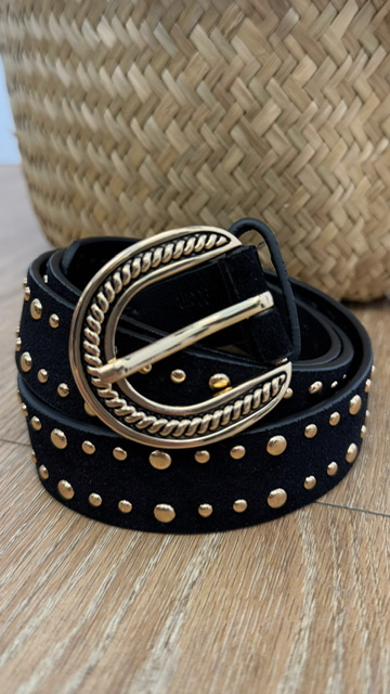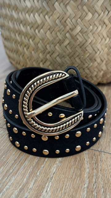 Cinturón de antelina de 90 cm en color negro con tachas doradas.