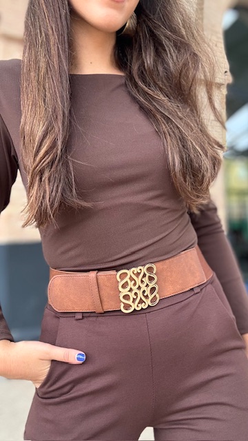 Cinturón elástico con logo dorado.