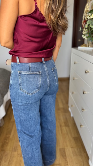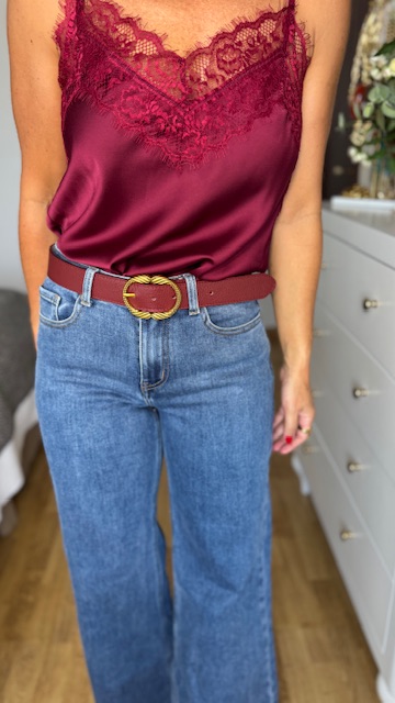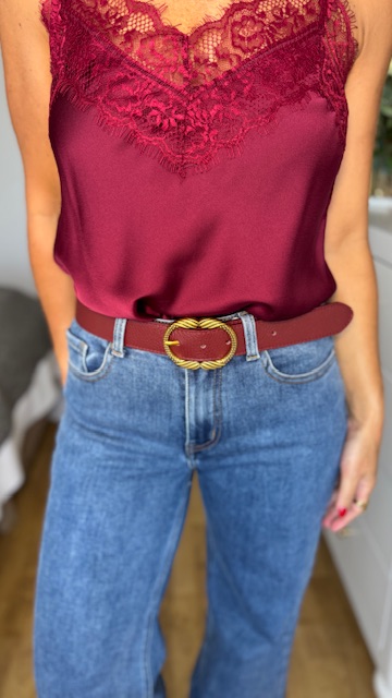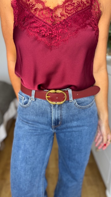 Cinturón de piel en color burdeos con hebilla dorada envejecida. Disponible por tallas.