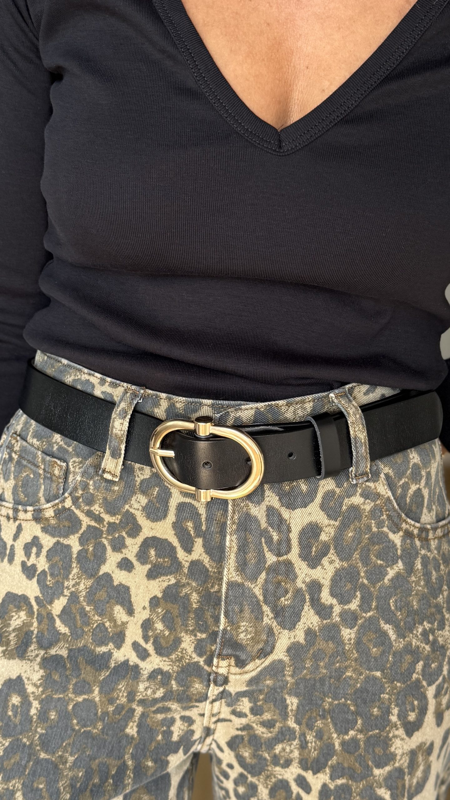 Cinturón de piel con hebilla dorada en color negro. Disponible por tallas.