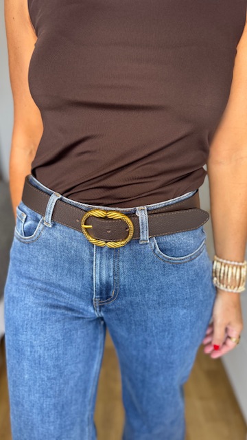 Cinturón de piel en color marrón oscuro con hebilla dorada envejecida. Disponible por tallas.