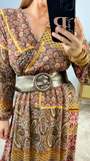 Cinturón de piel efecto metalizado con hebilla redonda. Disponible en color dorado, plateado y plomo. Talla única.