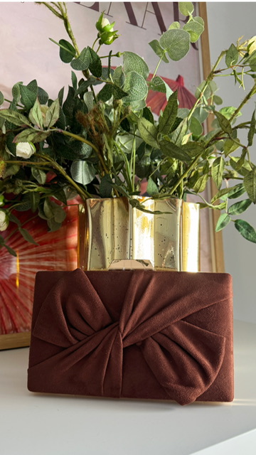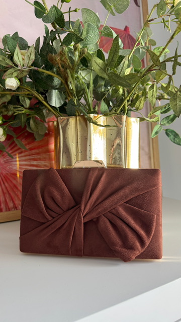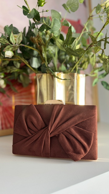Clutch con lazada en la parte delantera en color marrón.