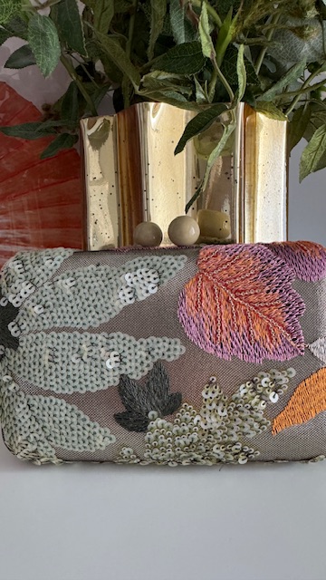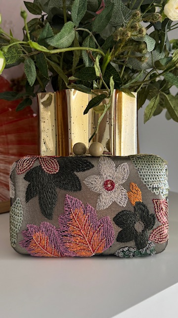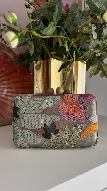 Bolso en color verde caza con estampado con lentejuelas. Lleva su correa en el interior.