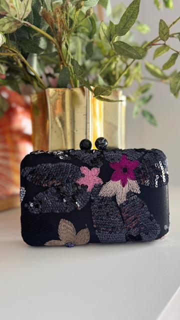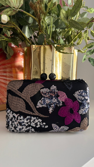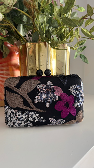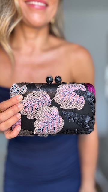 Clutch en color negro con estampados de lentejuelas en distintos colores.Lleva cadena dorada.