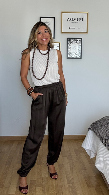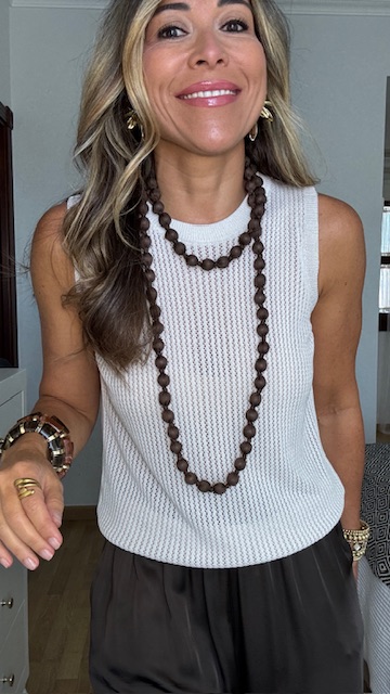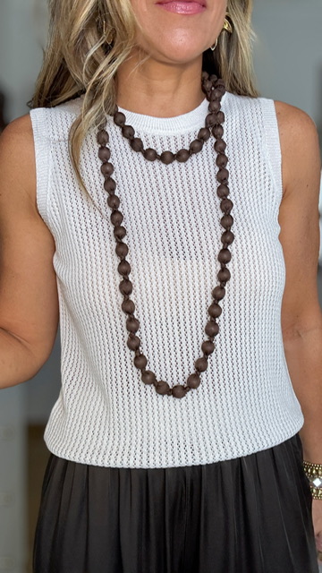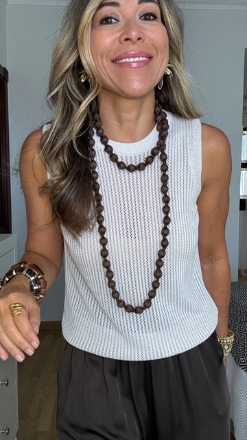 Collar largo confeccionado con cuentas forradas de tejido sedoso en color marrón. ideal para llevar en looks tanto casual como más de arreglada.