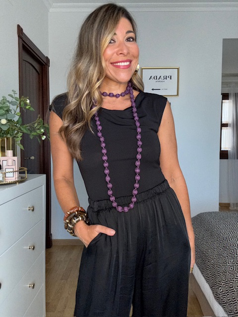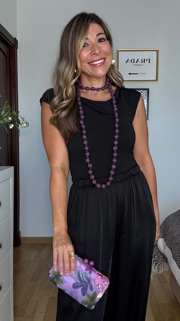Collar largo confeccionado con cuentas forradas de tejido sedoso en color morado. ideal para llevar en looks tanto casual como más de arreglada.