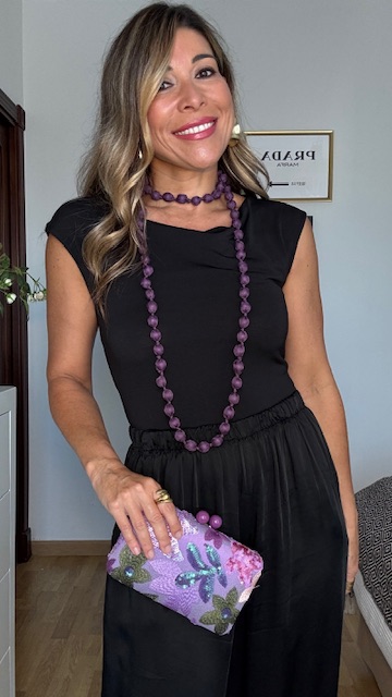 Collar largo confeccionado con cuentas forradas de tejido sedoso en color morado . ideal para llevar en looks tanto casual como más de arreglada.