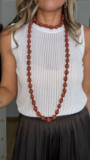 Collar largo confeccionado con cuentas forradas de tejido sedoso en color teja. ideal para llevar en looks tanto casual como más de arreglada.