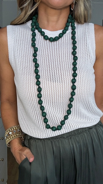 Collar largo confeccionado con cuentas forradas de tejido sedoso en color verde oscuro. ideal para llevar en looks tanto casual como más de arreglada.