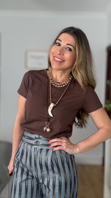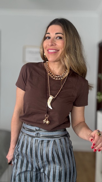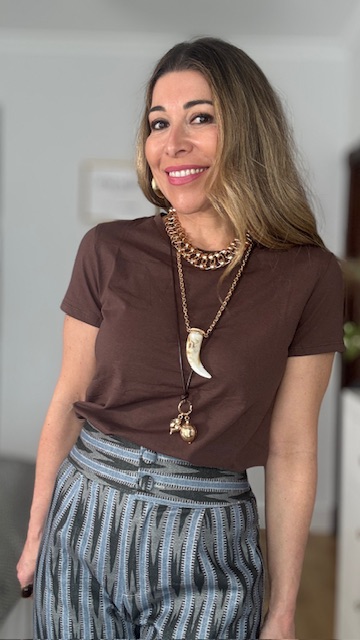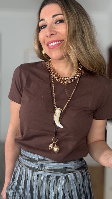 Gargantilla triple con tres tipos de collar: una gargantilla de eslabones en dorado, otro collar de largo medio con colgante de colmillo y una última con cordón de piel y colgante con adorno en dorado. Acero inoxidable.