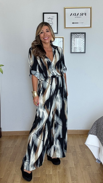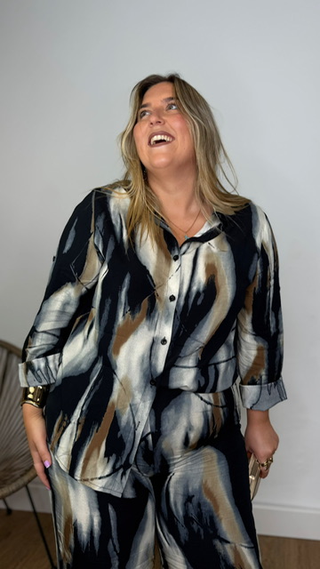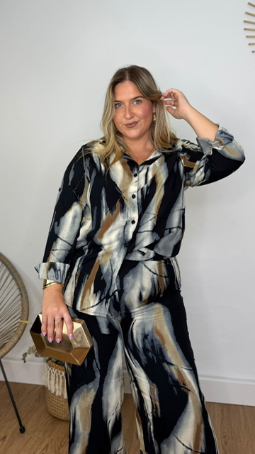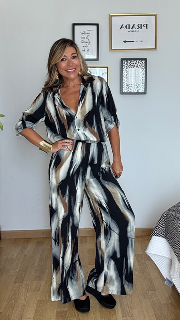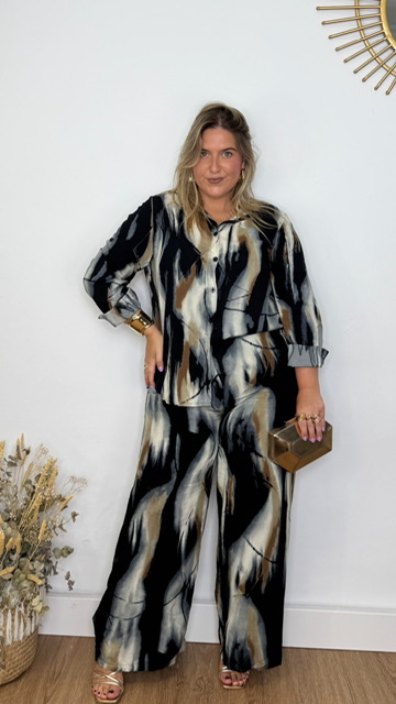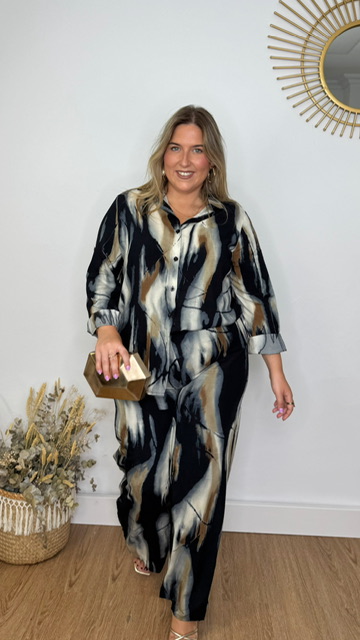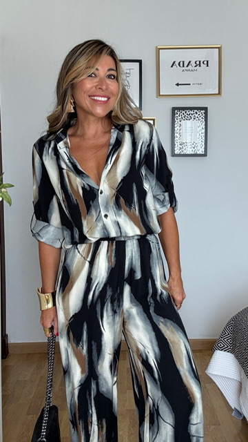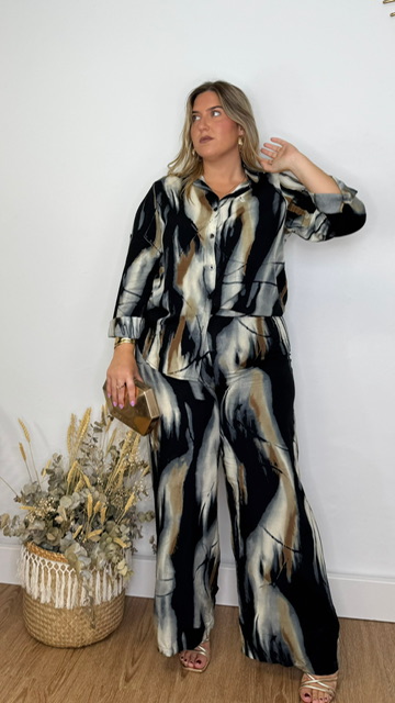 Conjunto de pantalón y camisa confeccionado en tejido de viscosa con estampado de estilo acuarela en tonos negros y grises. Pantalón con cinturilla elástica. Disponible en tallas SMLXL