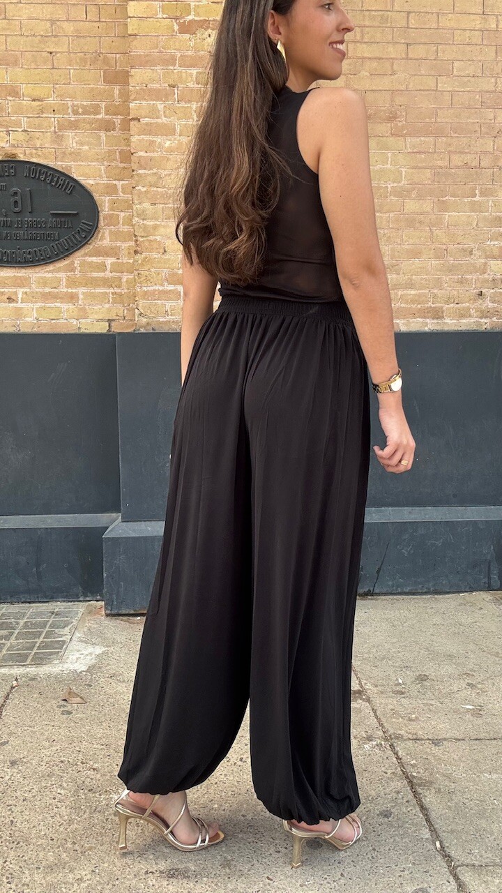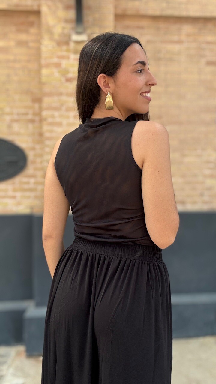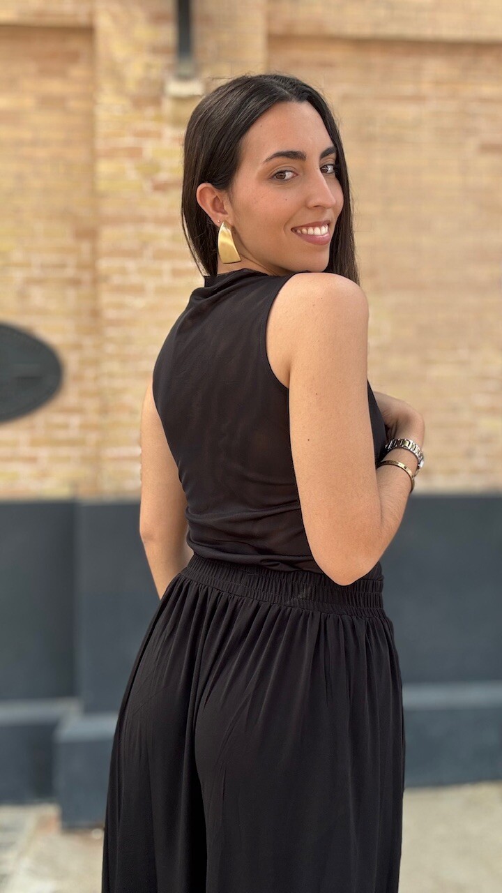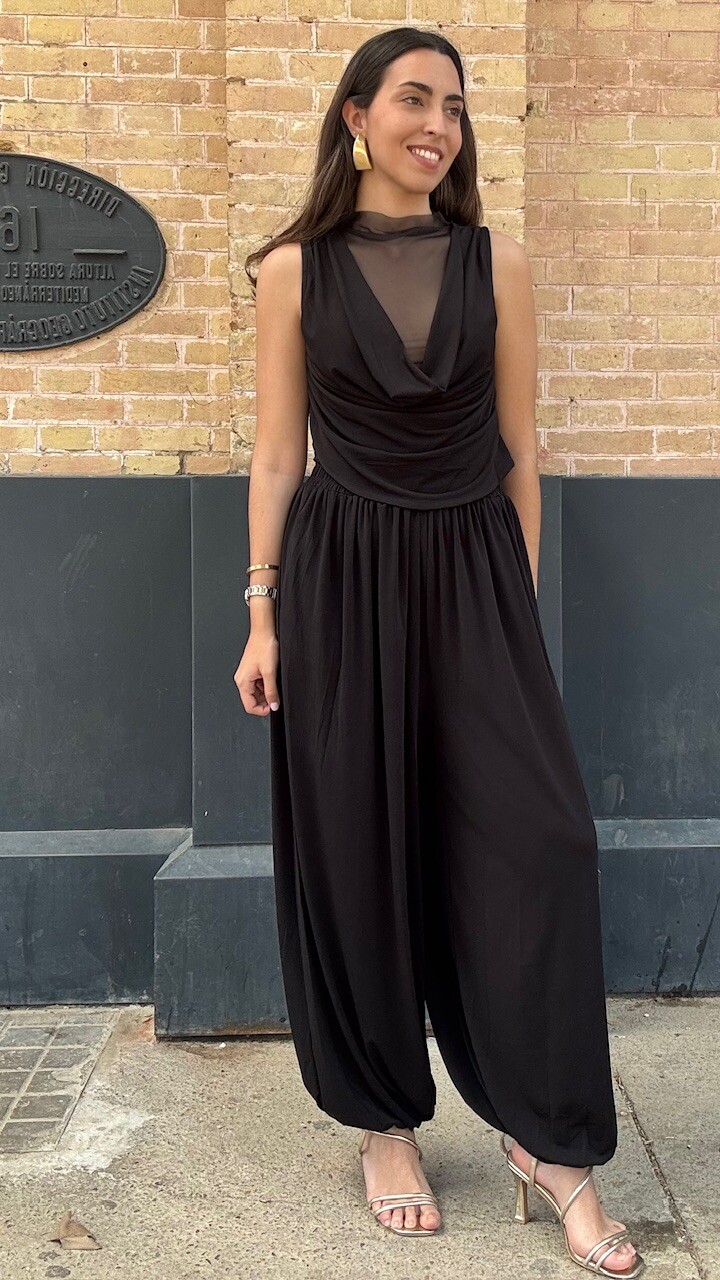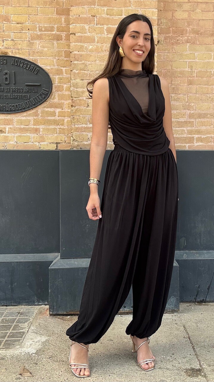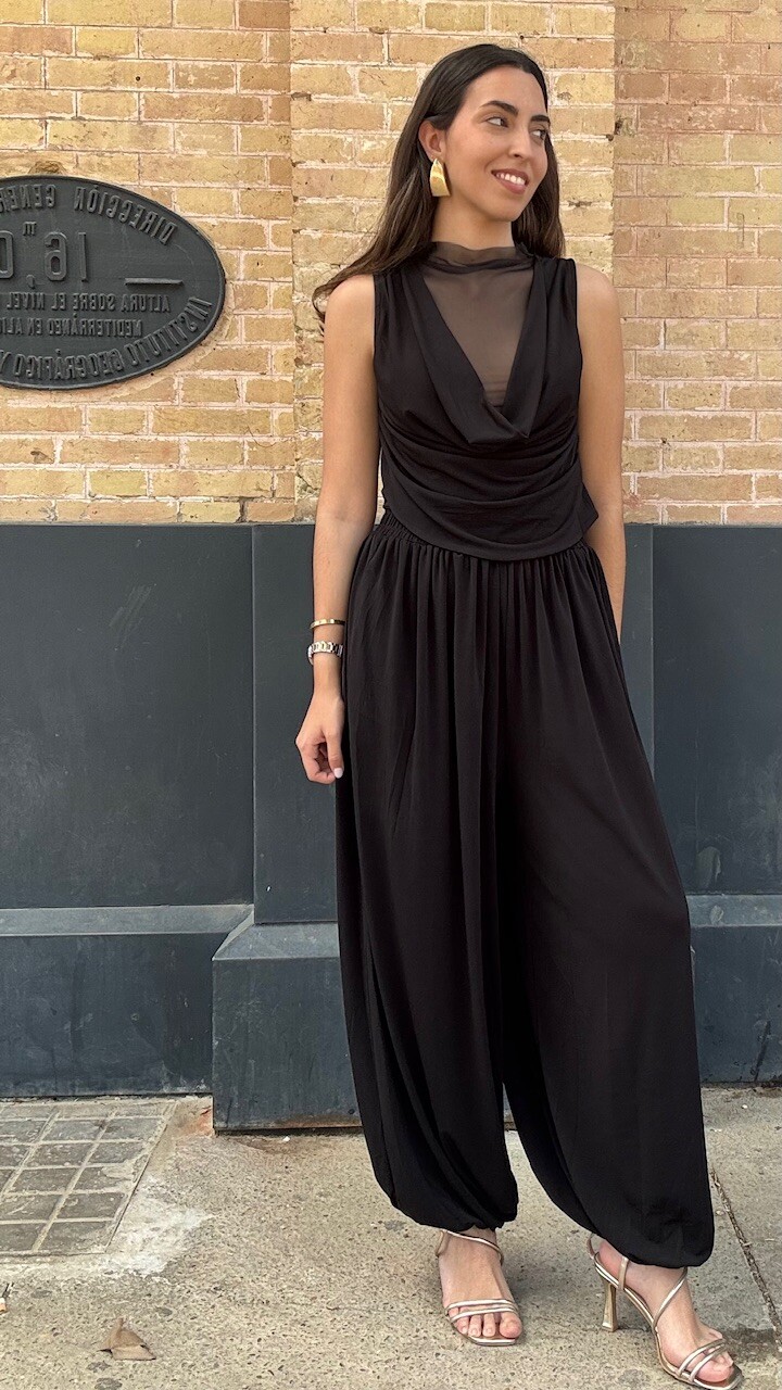 Conjunto compuesto por top de tul de manga corta y pantalón bombacho con cinturilla elástica en color negro. Disponible por tallas.